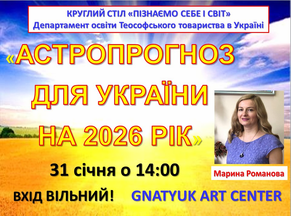 Запрошую вас 31 січня о 14-00 на відкриту лекцію за темою «АСТРОПРОГНОЗ ДЛЯ УКРАЇНИ НА 2026 рік», яка проходитиме в Гнатюк Арт-Центрі!